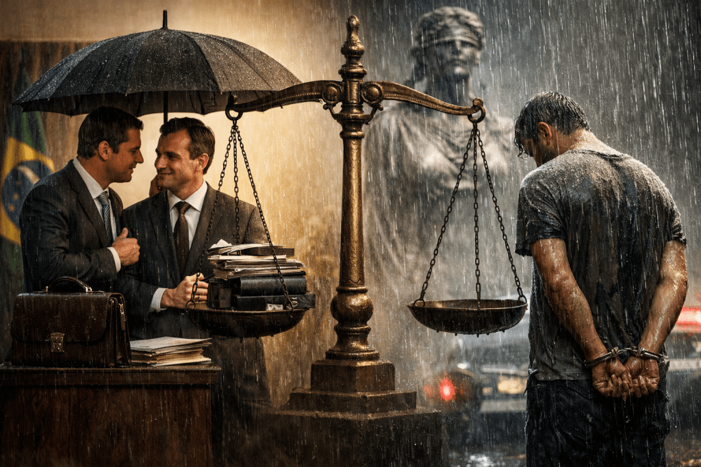 A lei cai do céu com a mesma força sobre ricos e pobres, mas uns chegam de capa impermeável, outros de camiseta rasgada.